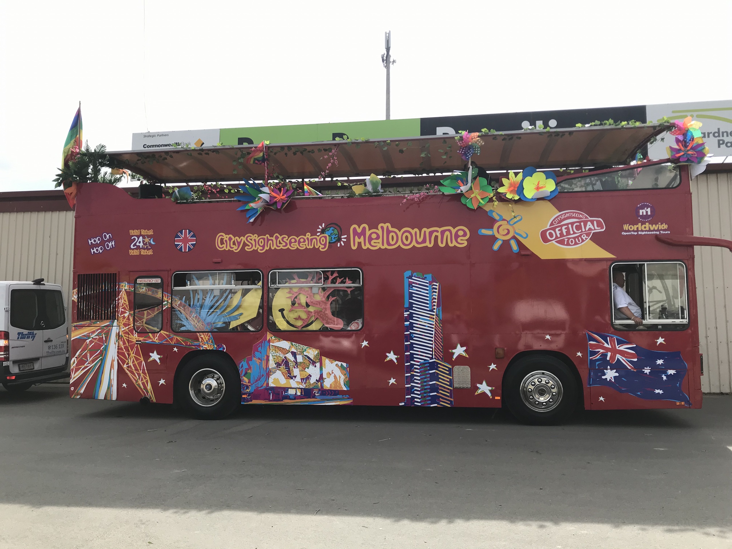 For the roaming stage we covered a Melbourne City double-decker sightseeing bus in flowers and greenery and for the Toga Party that followed in the festival’s iconic Dr Dan’s Colosseum, we used custom printed logo fabric to create togas for the performers and patrons while creating drapes to dress both the lower and upper levels of the stage.