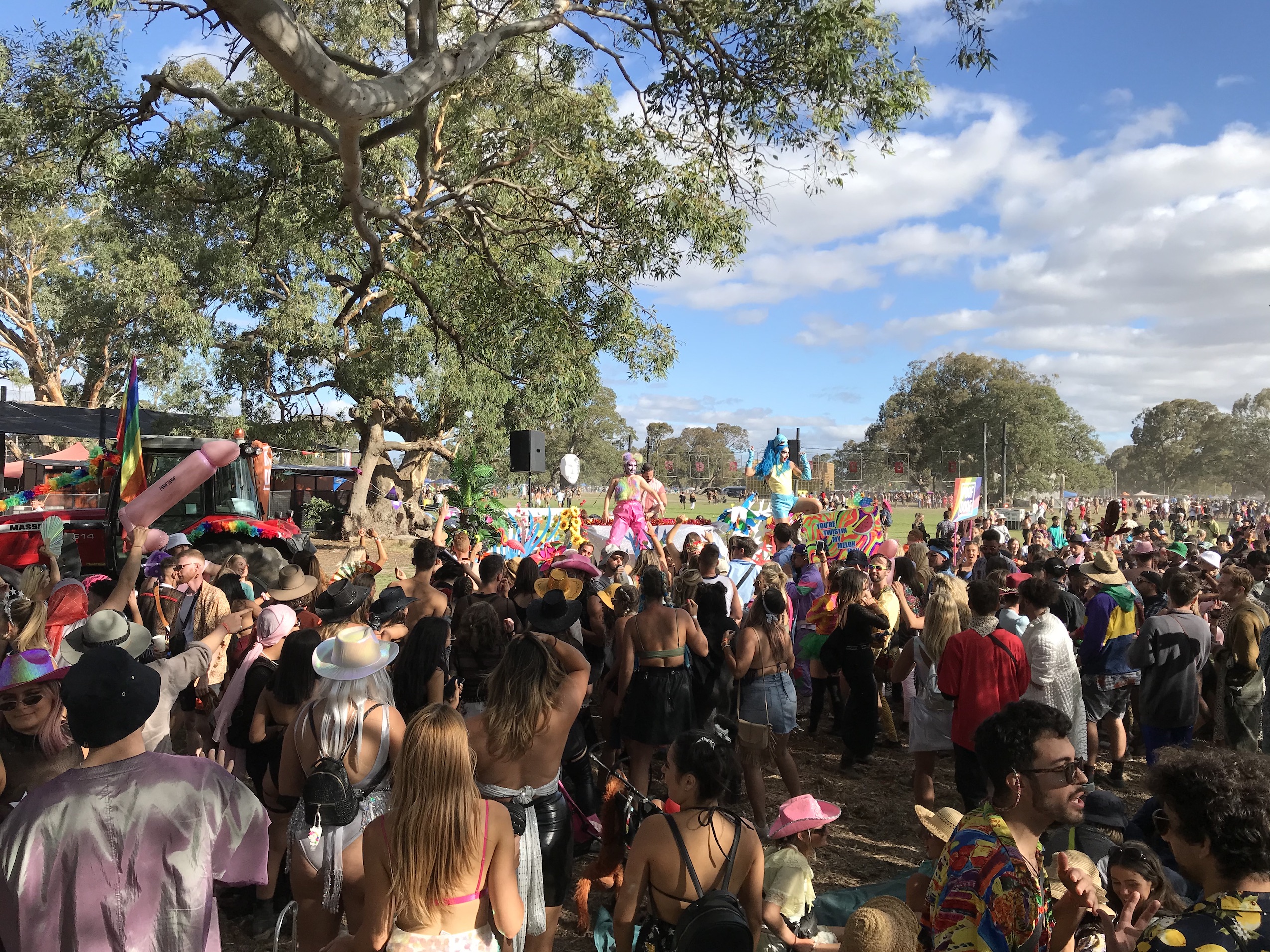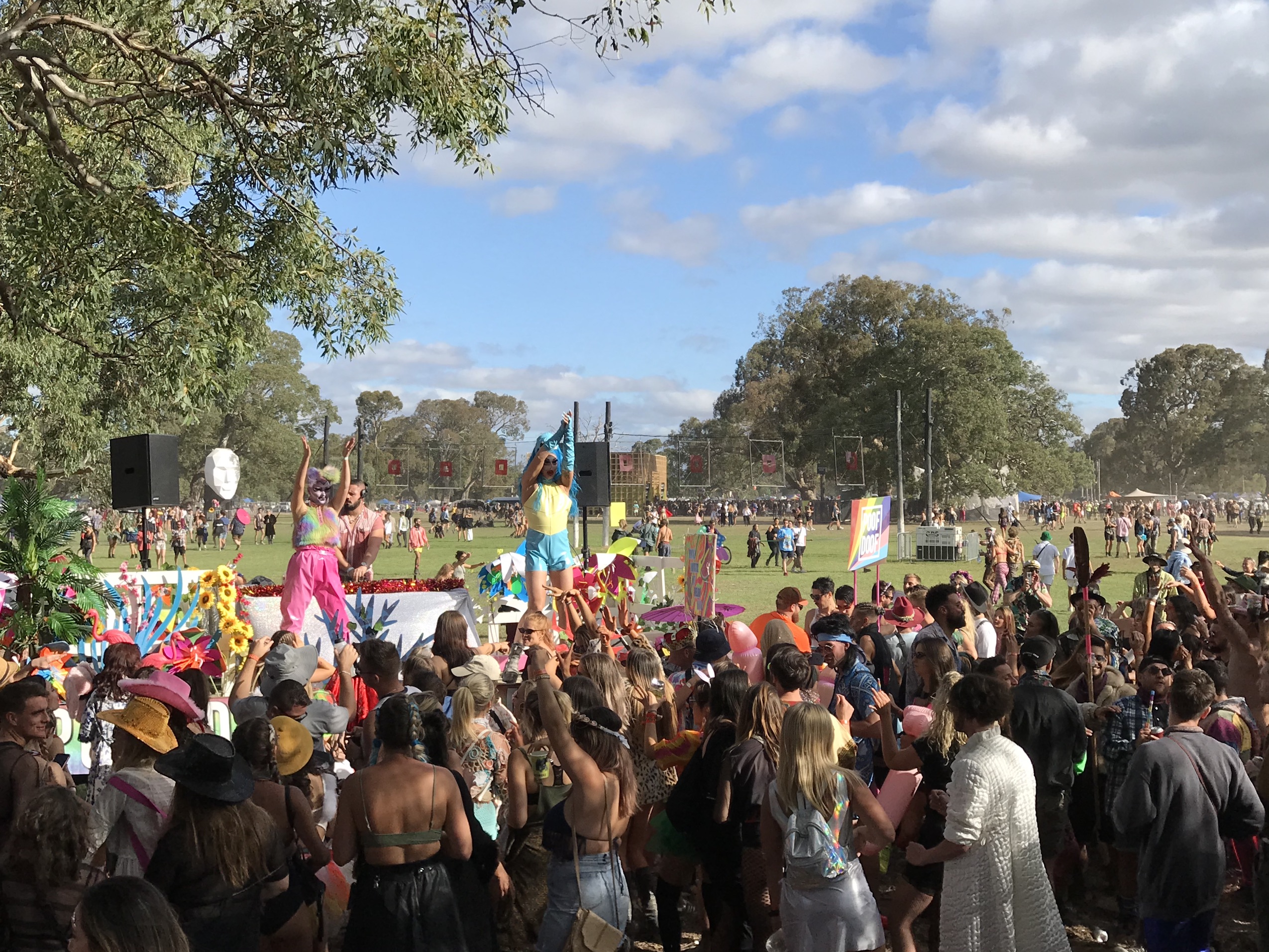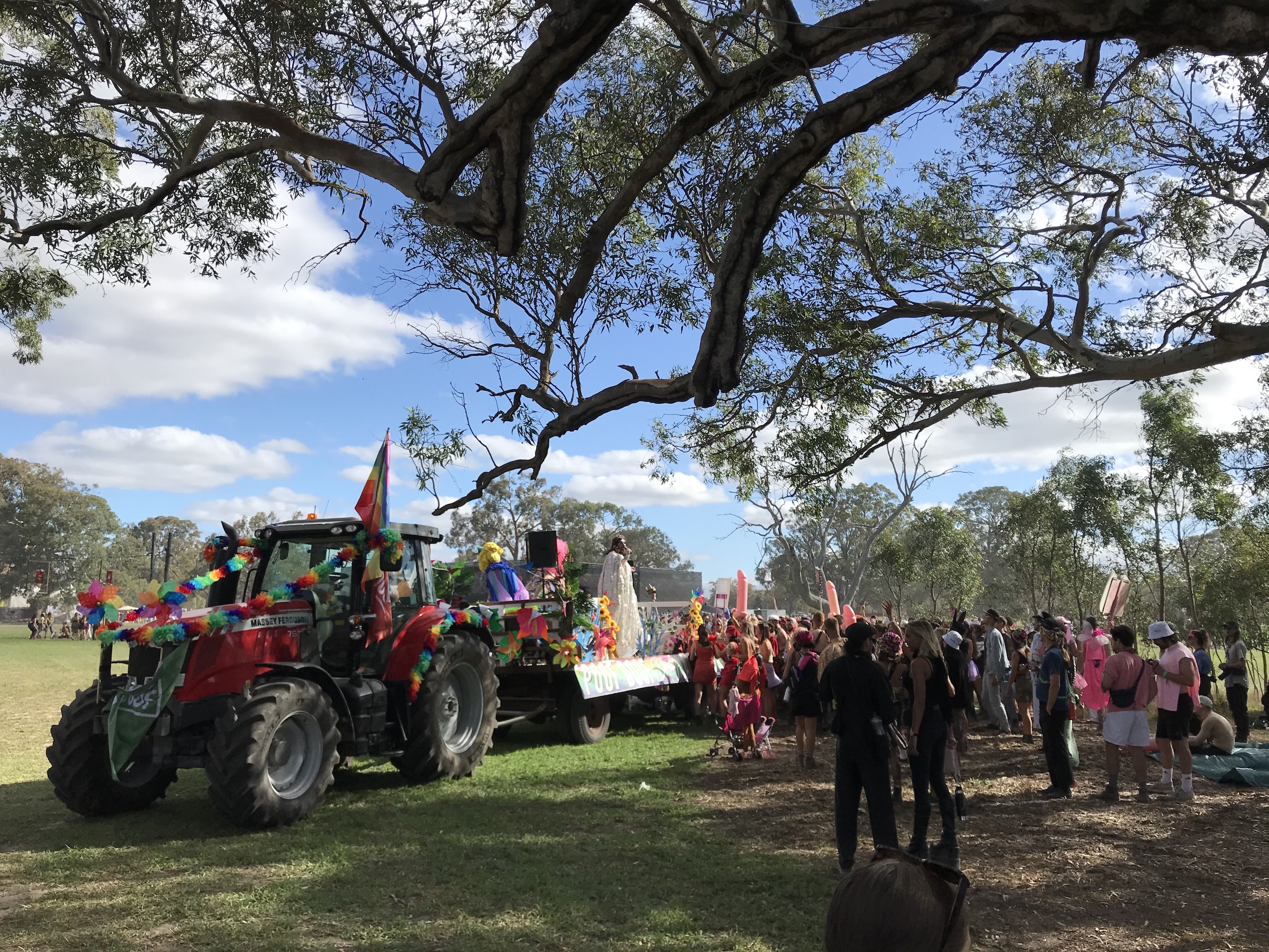 For the roaming stage we converted a neighbouring farm’s tractor and flat-bed trailer into a rainbow farm themed performance space which we lapped around the grounds and landed in a shady area in the centre of the festival.