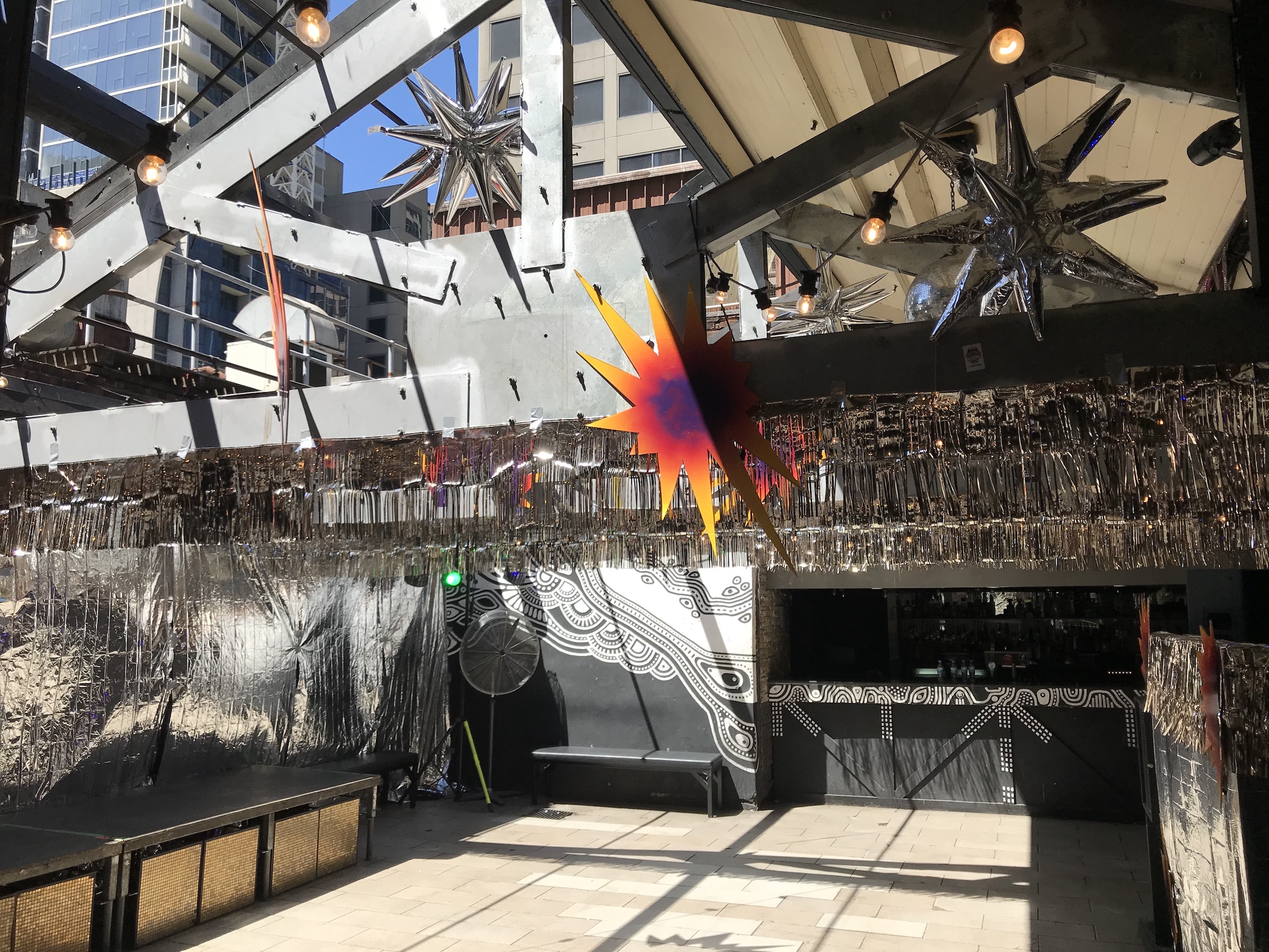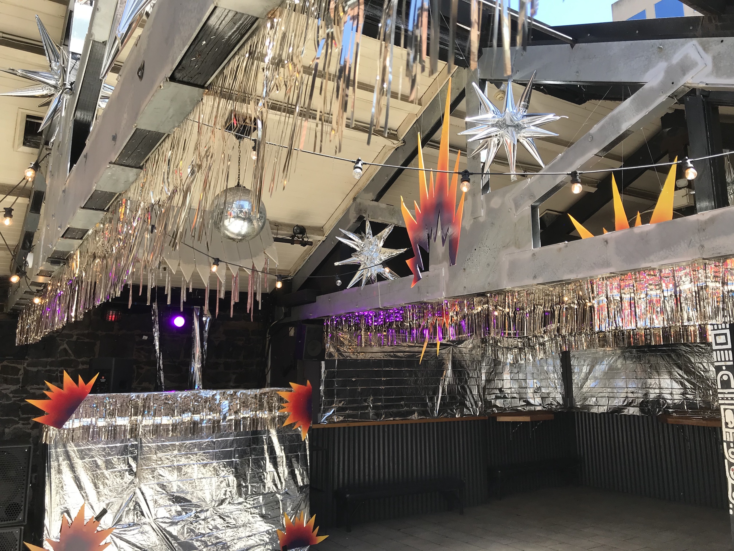 For this we used a mixture of silver foiled balloons and streamers torn apart visually by explosions of vibrant red and purple cutouts.